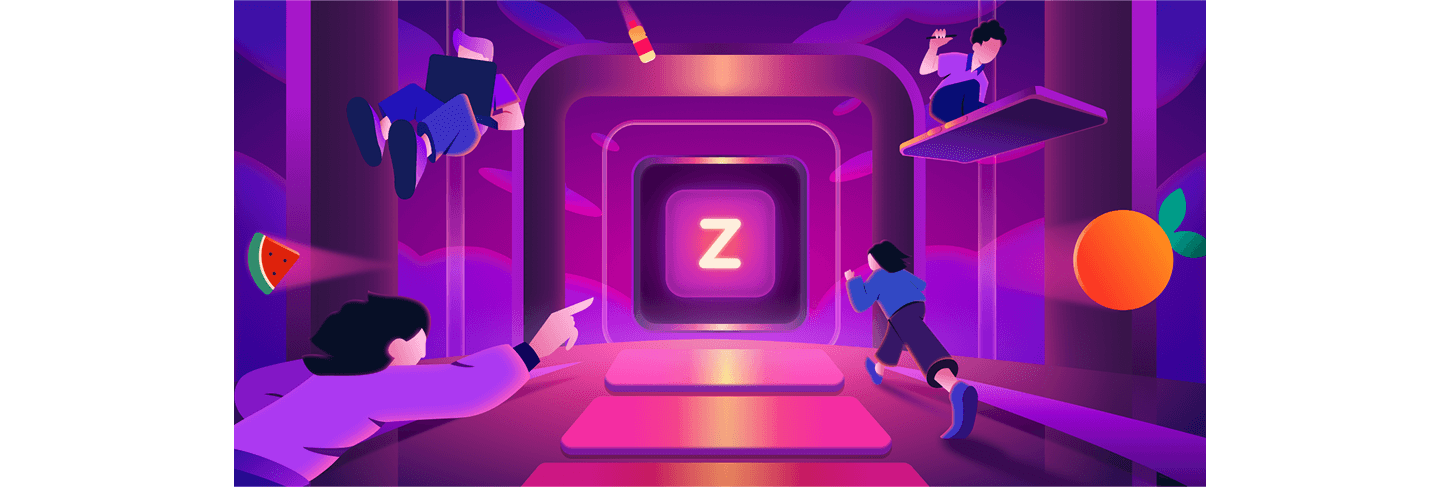 This illustration captures how technology brings Zepto to life a dynamic space where creators, coders, and innovators move toward one shared goal. The glowing Z at the center represents Zepto’s core, built through teamwork, imagination, and fast-moving tech. Vibrant colors and motion show the energy and speed that drive Zepto forward.