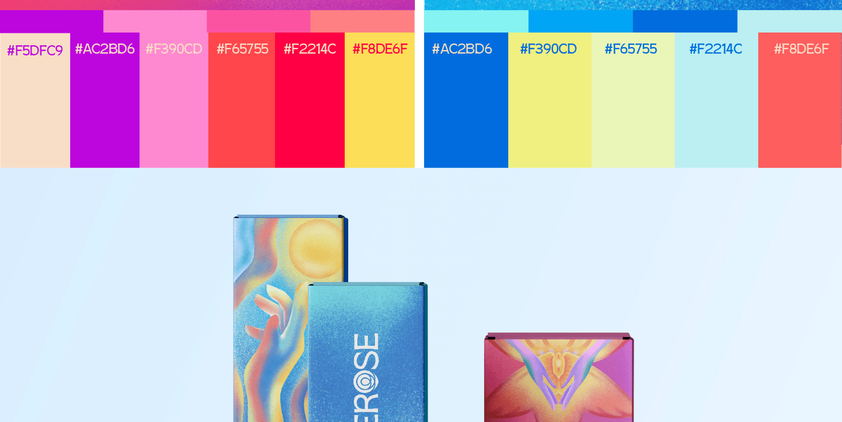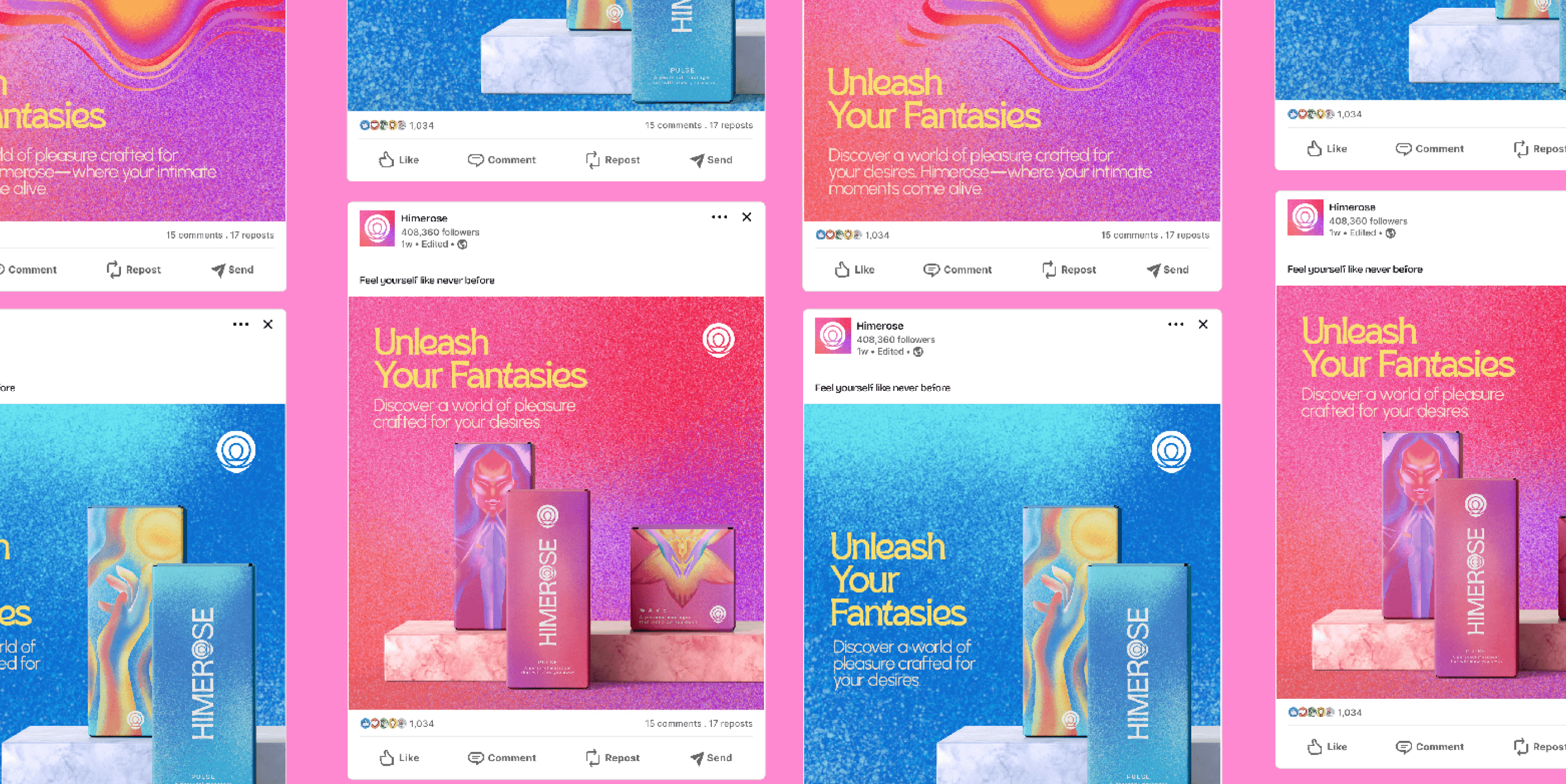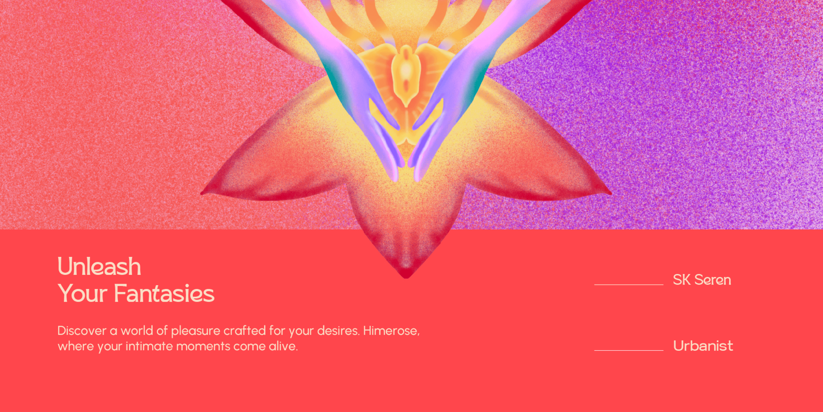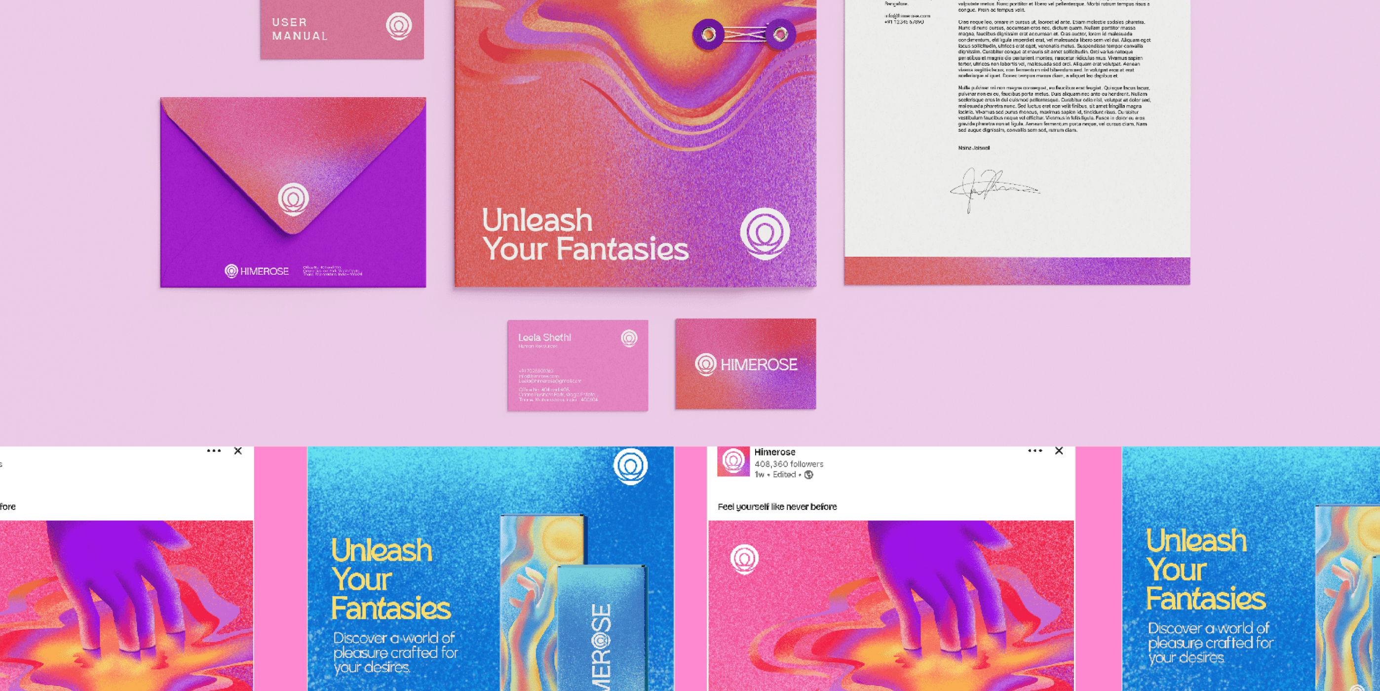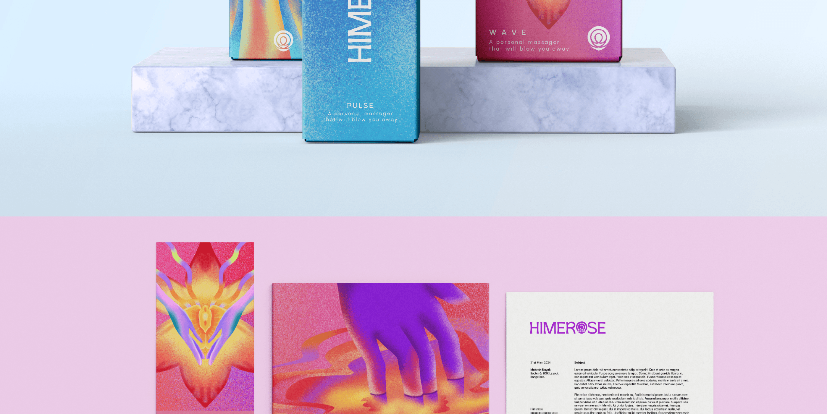 Himerose embodies the harmony of body and mind through a design that merges enlightenment with sensuality. The rose-inspired logo symbolizes awakening, while the grain texture and vibrant gradients evoke ripples of sensation and connection.